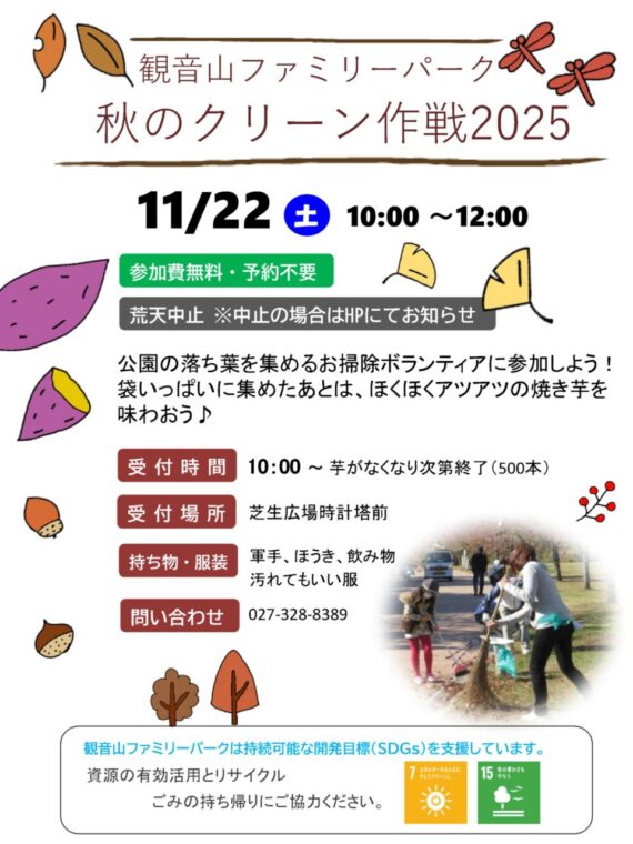 EVENTイベント情報 秋のクリーン作戦 ★開催予定2025年11月22日(土) イベント 2025.11.22(土)秋のクリーン作戦! 来園者のみんなで公園をお掃除するボランティア企画! 公園の落ち葉を集めるお掃除ボランティアに参加しよう。 集めた落ち葉と引換えにアツアツの焼き芋を味わってみませんか? ※小雨決行 ※芋がなくなり次第終了(予定数500本) ●受付時間 10:00~ ●受付場所 芝生広場 時計塔前 ●持ち物 軍手、ほうき(貸出あり)、飲み物、作業の出来る服装 お知らせ一覧